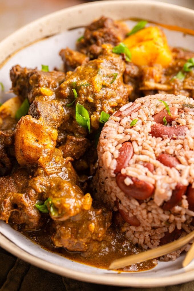 A staple side dish made with rice cooked in coconut milk and kidney beans, seasoned with thyme and scotch bonnet peppers.