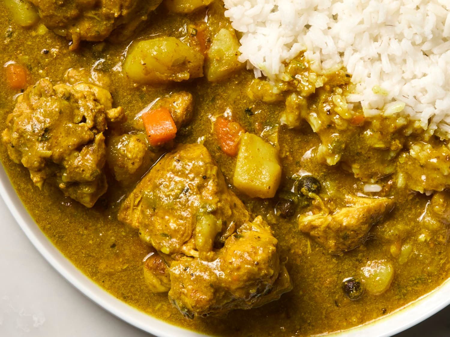 Tender pieces of chicken simmered in a fragrant curry sauce, served with rice and peas.