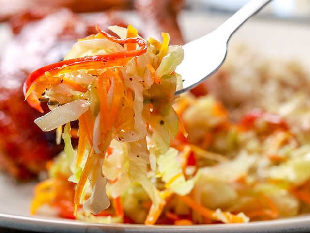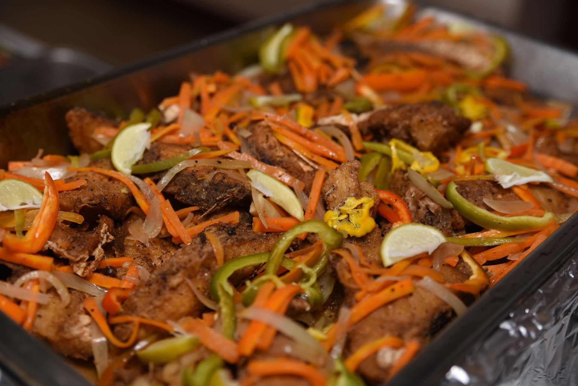 Fried fish topped with a spicy vinegar-based sauce, onions, carrots, and peppers.