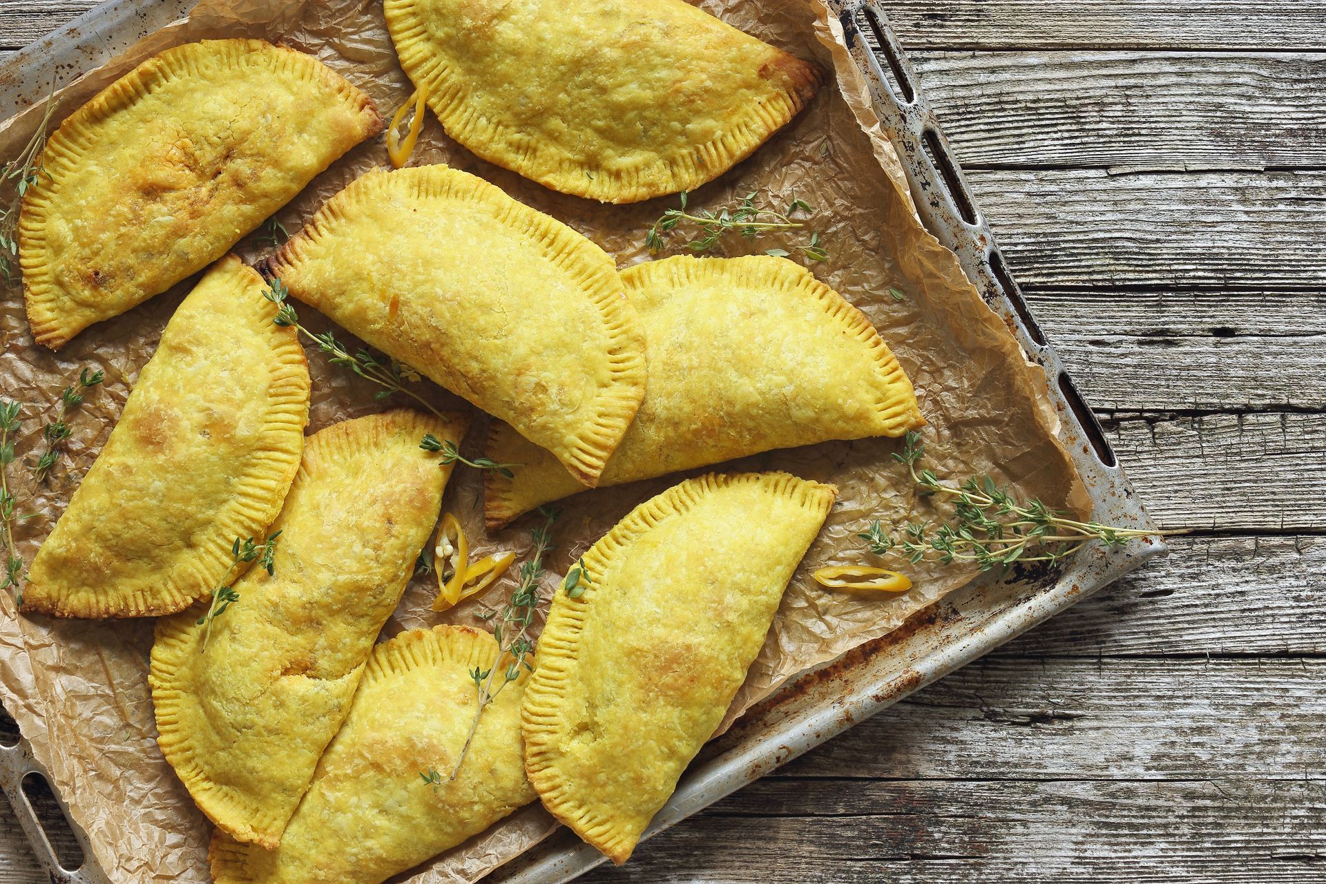 Flaky pastry filled with seasoned meat, vegetables, or cheese, available in traditional Jamaican flavors.